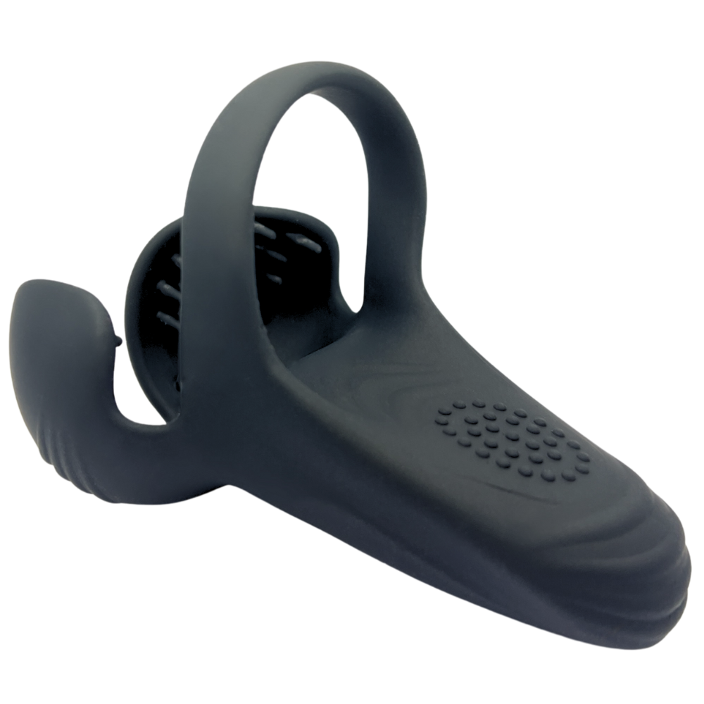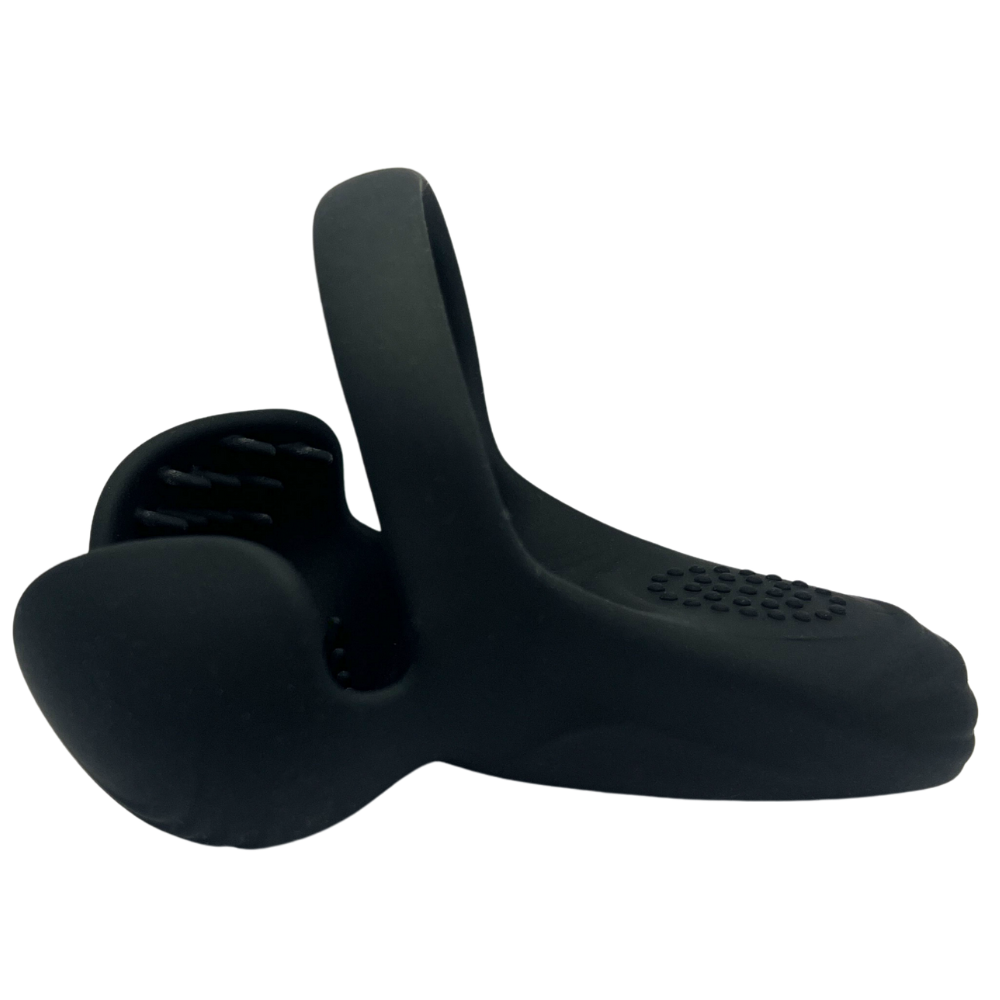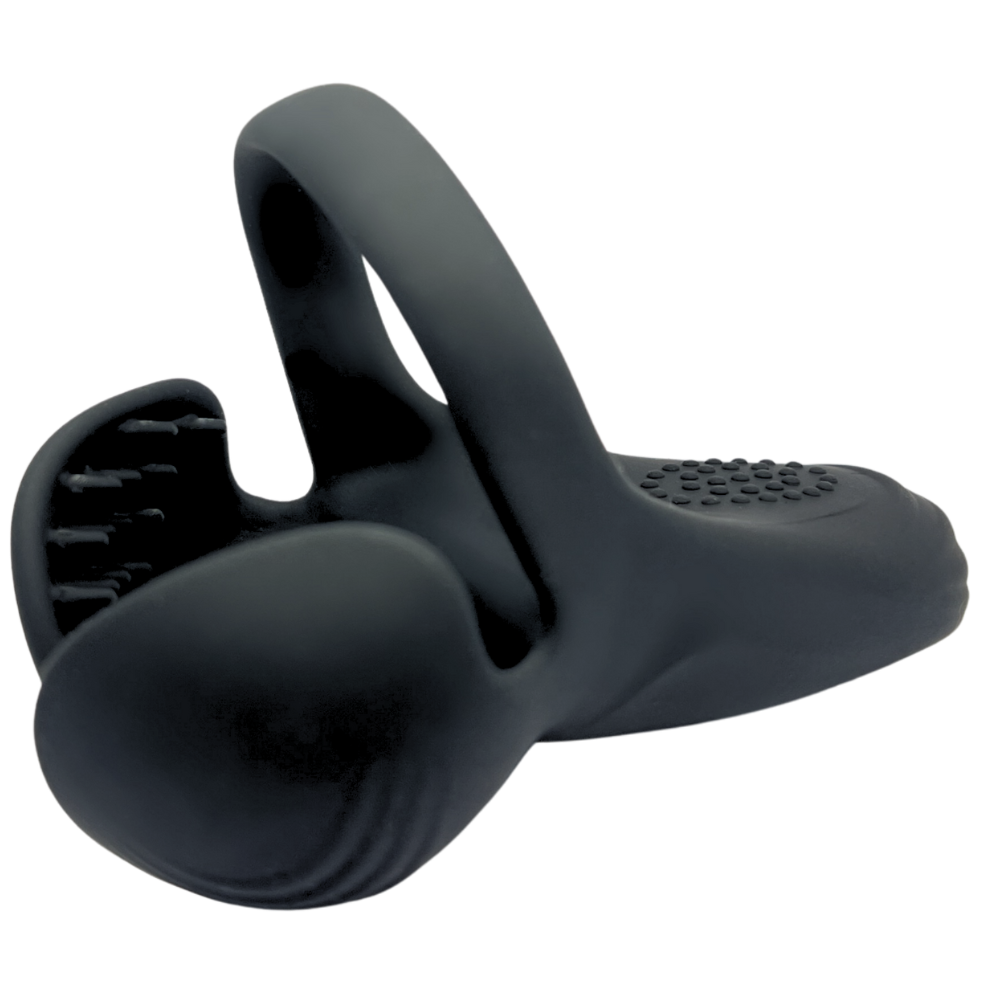 A vibrating taint and ball cradle cock ring designed for tight, close-hanging anatomy. This stretching silicone cock ring combines targeted perineum stimulation with 10 vibration patterns, ribbed body-safe silicone, magnetic USB charging, and a fully waterproof design.
